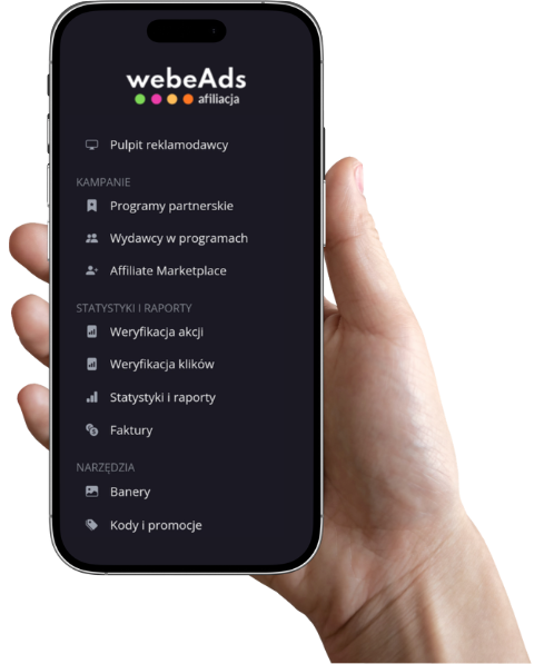 System zapewnia pełny tracking ruchu i transakcji generowanych przez wydawców, raportowanie wyników, kontrolę nad stawkami, dostęp do sieci wydawców, automatyczne rozliczenia i narzędzia afiliacyjne wspomagające sprzedaż. webeAds działa w modelu self-service — samodzielnie decydujesz ile płacisz za wynik, kogo dopuszczasz do swojego programu i na jakie działania zezwalasz wydawcom.