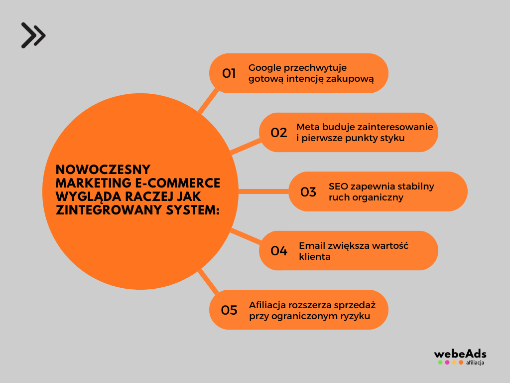 Największy błąd w ecommerce polega na traktowaniu kanałów w oderwaniu od siebie. Google, Meta, SEO, email i afiliacja nie konkurują — one się uzupełniają.